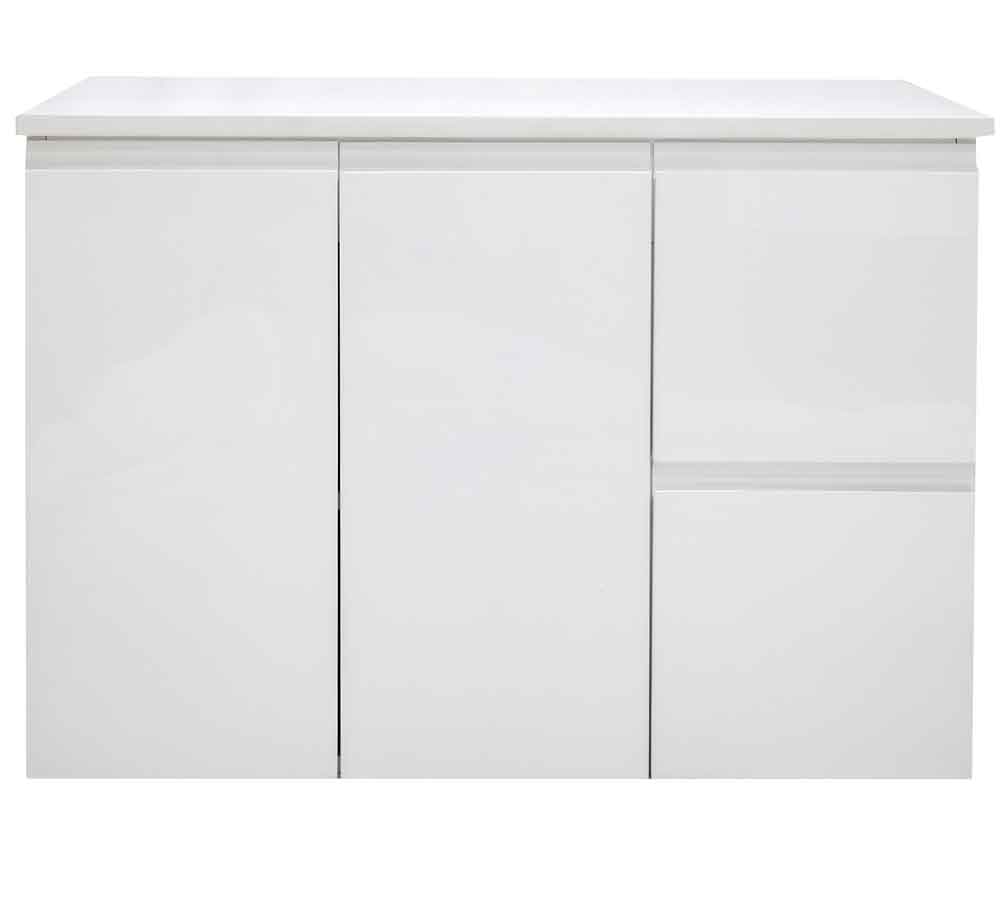 The Koro Range of wall hung vanities have a white or matte black polyurethane 2 pack cabinet with a choice of stone top and choice of bowl or any moulded top, solid doors and pull finger handles.